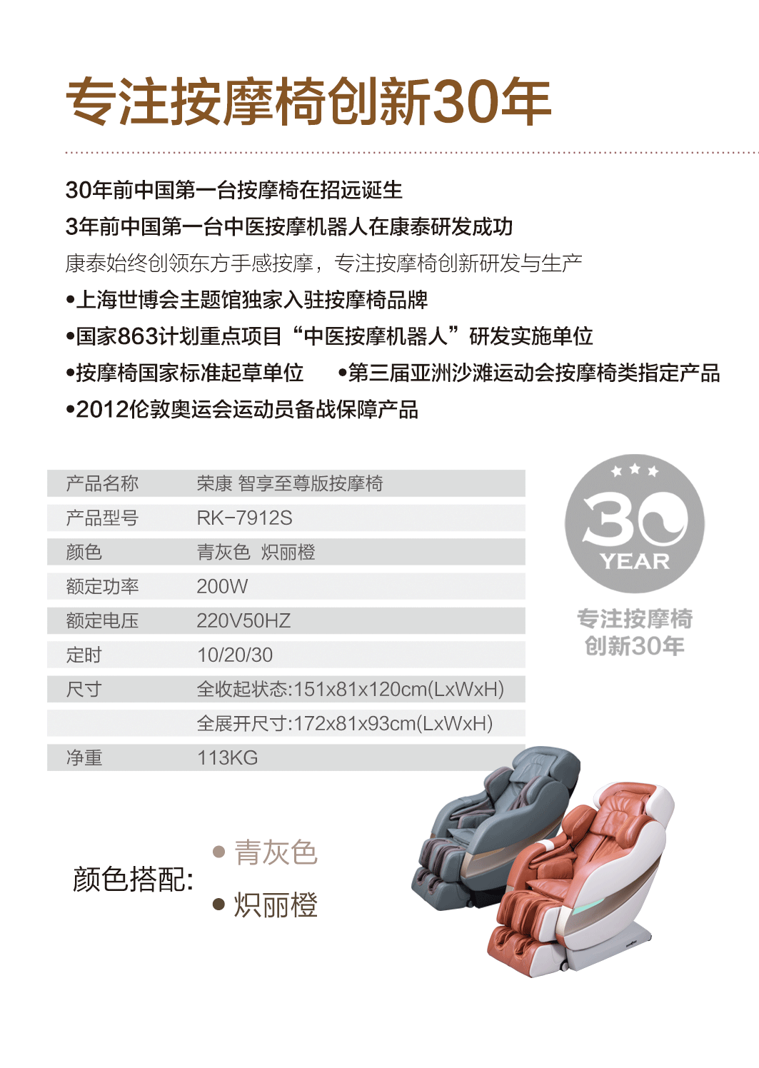 • 產(chǎn)品名稱:ROKOL/榮康RK-7912S智享按摩椅
