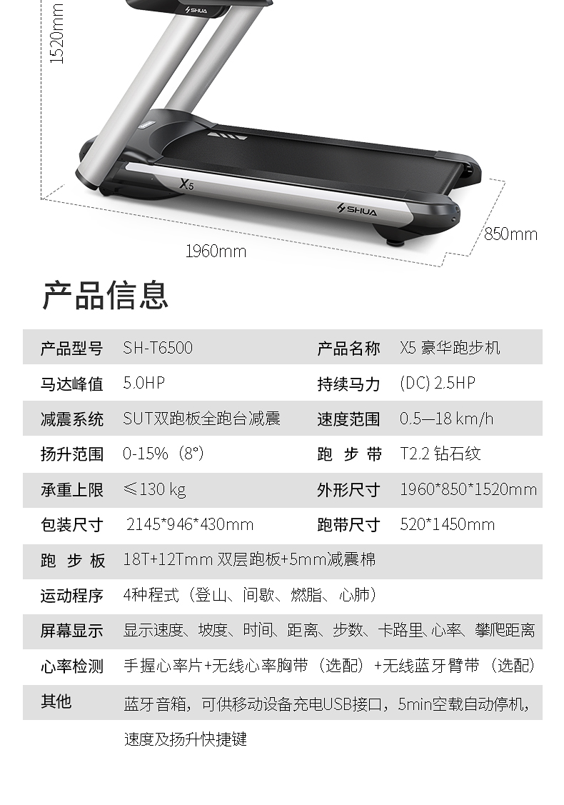 • 產(chǎn)品品牌:SHUA/舒華跑步機(jī)家用靜音豪華健身運(yùn)動器材新X5/SH-T6500 新x5升級版