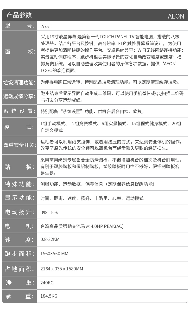 • 產(chǎn)品名稱:AEON/正倫大型商用跑步機(jī)A75T專業(yè)智能專業(yè)健身房健身器材